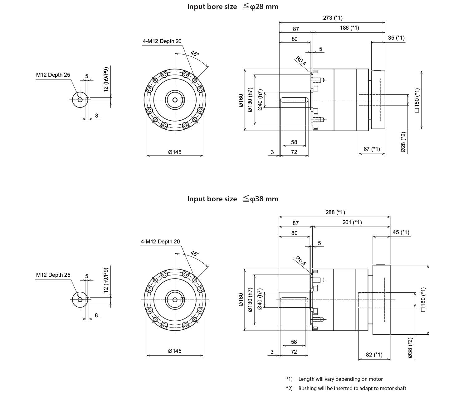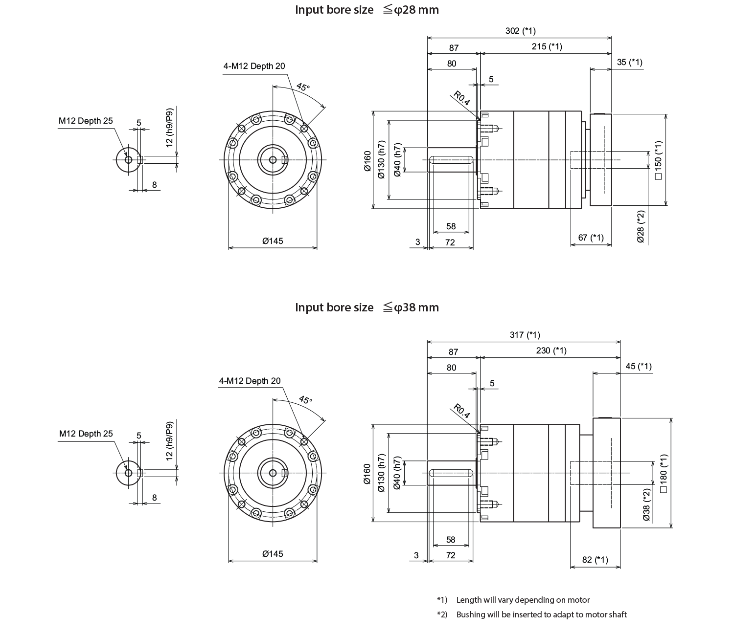 Our motor mounting codes can be configured automatically using our online selection tool. These tables supply the details behind these codes. The tables start with Input Bore measurement and the Part # Code, which are indicated at the end of every model code.