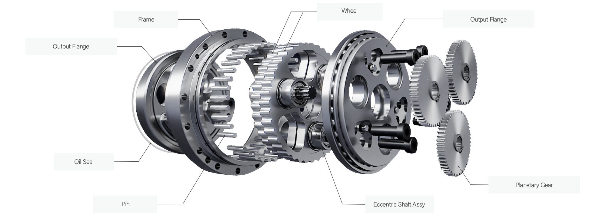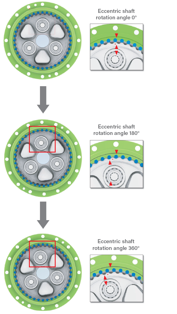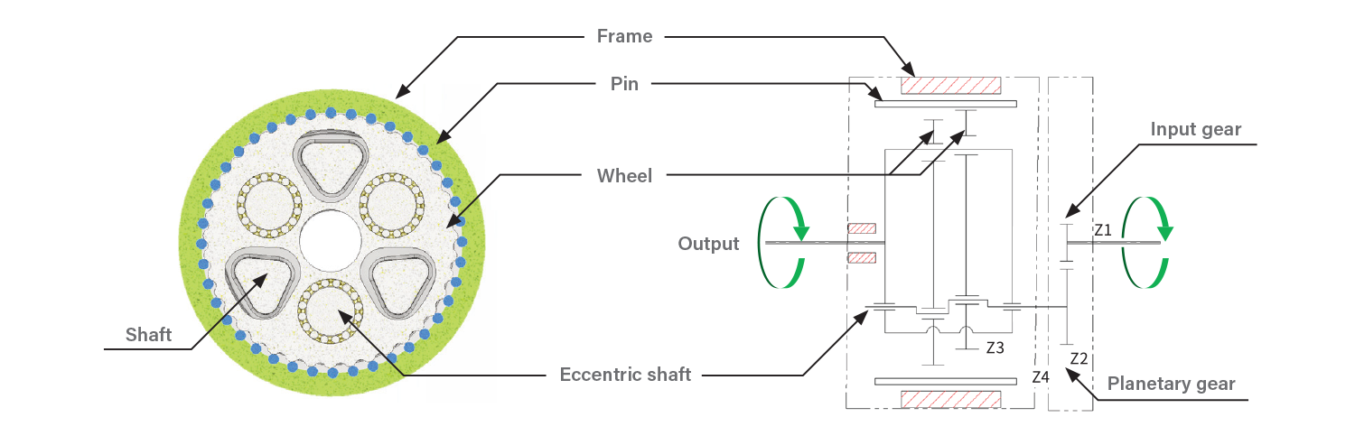 With the KINEX fixed on the frame, when the input gear rotates the planetary gear, the eccentric shaft directly connected to the planetary gear also rotates.