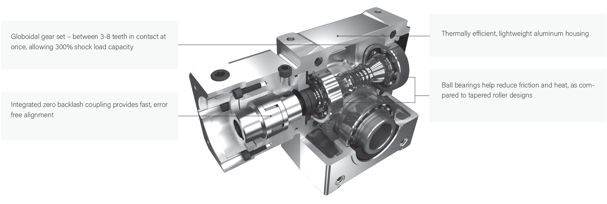 The all-aluminum housing construction offers weight savings of up to 30% with improved thermal performance. Vent-free and lubricated for life with synthetic oil, it is a low-maintenance solution ideal for packaging, material handling, and automation applications.