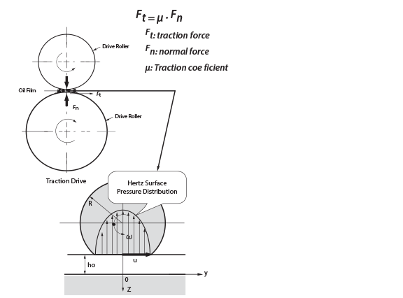 • The speed differential between the rollers creates a tangential force (traction force, Ft) that shears the oil film