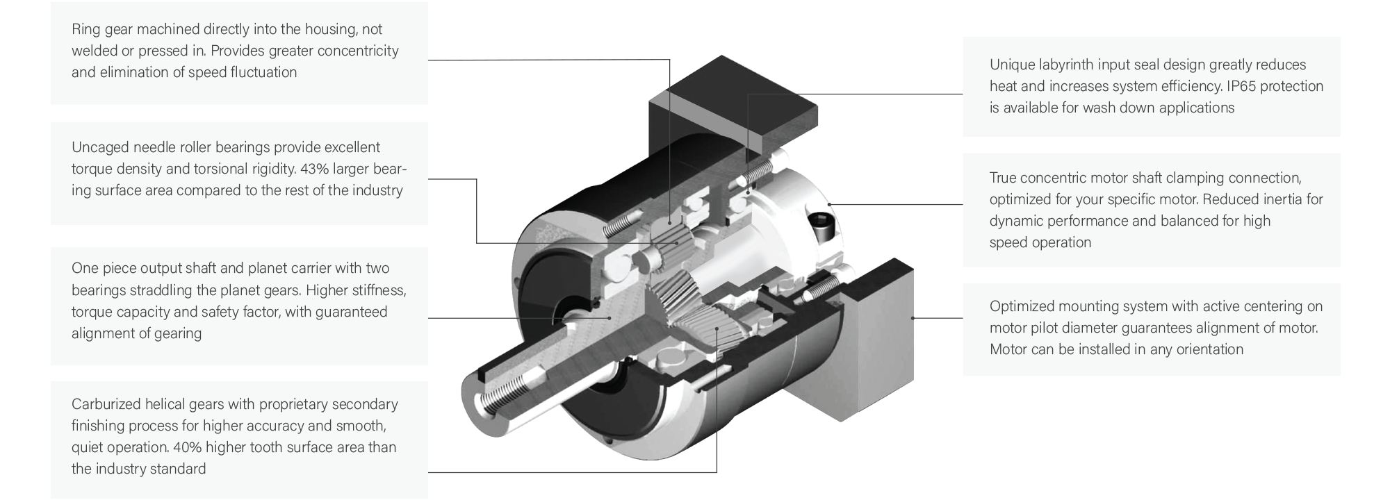 The VRL Series stands out as a versatile solution in the planetary gear reducer market. Featuring helical gearing, durable internal construction, smooth operation, high torque density, and it delivers top-tier performance. With an impressive 5 arc-minute backlash, the VRL is ideal for applications requiring both precision and dynamic performance, while still being mindful of cost.