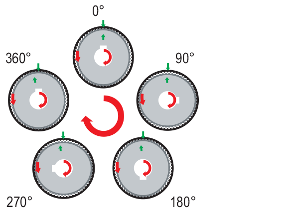With internal gear fixed and cam (input) rotated clockwise, the flex gear (output) rotates counter clockwise. Direction and speed of rotation is determined by tooth count of gears and mounting geometry.