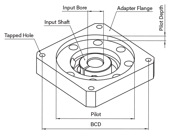 Input Bore (mm)Part # CodePilot (mm)BCD (mm)Tapped HolePilot Depth (mm)