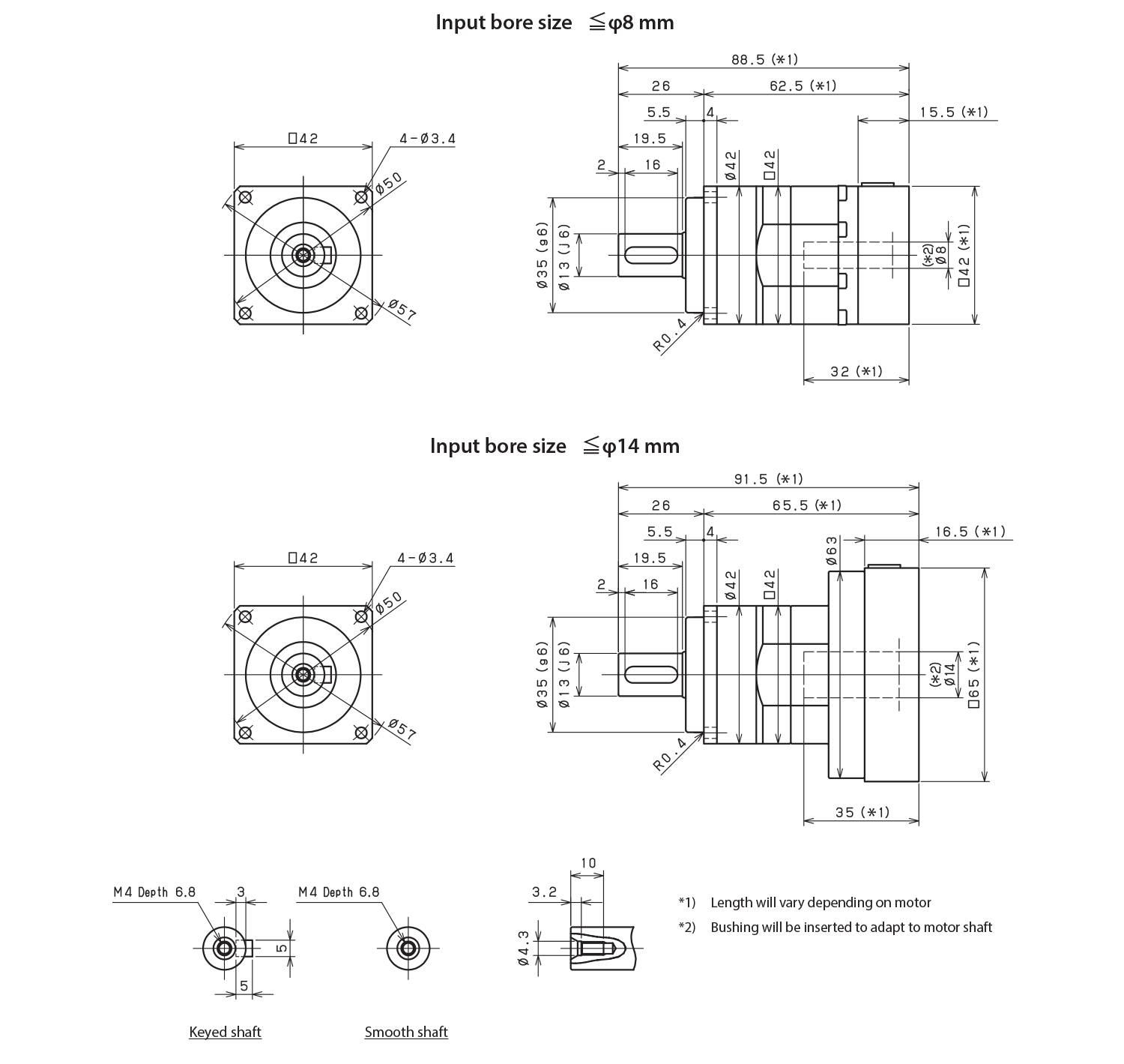 • Output Shaft Materials of Construction & Modifications: 300 Series Stainless, 400 Series Stainless, 17-4PH Stainless, Nickel Plating, Special Width, Special Length