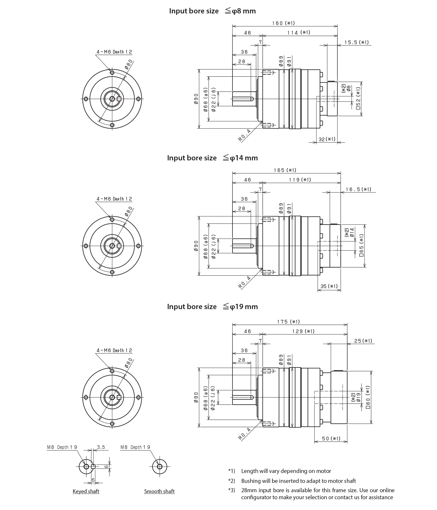 Our motor mounting codes can be configured automatically using our online selection tool. These tables supply the details behind these codes. The tables start with Input Bore measurement and the Part # Code, which are indicated at the end of every model code.