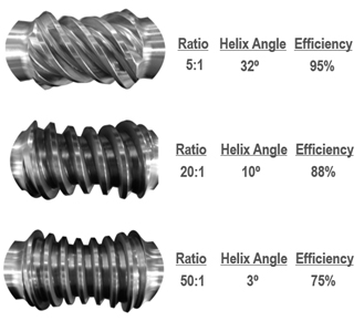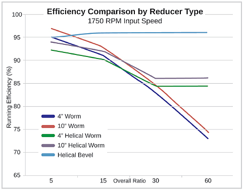 Worm gearbox efficiencies will vary with speed, ratio, load, ambient temperature, duty cycle, lubricant viscosity and break-in period. Accurate comparisons depend on the use of realistic efficiencies (for all gearboxes considered) and proper size selection.